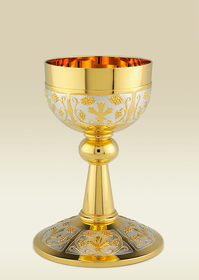 A mass chalice made of brass, gold-plated with silver-plated accents. Eucharistic grapevine motifs grace the cup and the base.