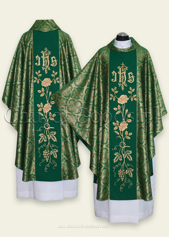 Fully lined. Front panels made on plain fabric decorated with IHS emblems & richly embroidered gold floral motifs. Front and back panels finished around the edges with soft gold cord. Standard set comprises one matching stole in gothic style. Standard length - 130cm