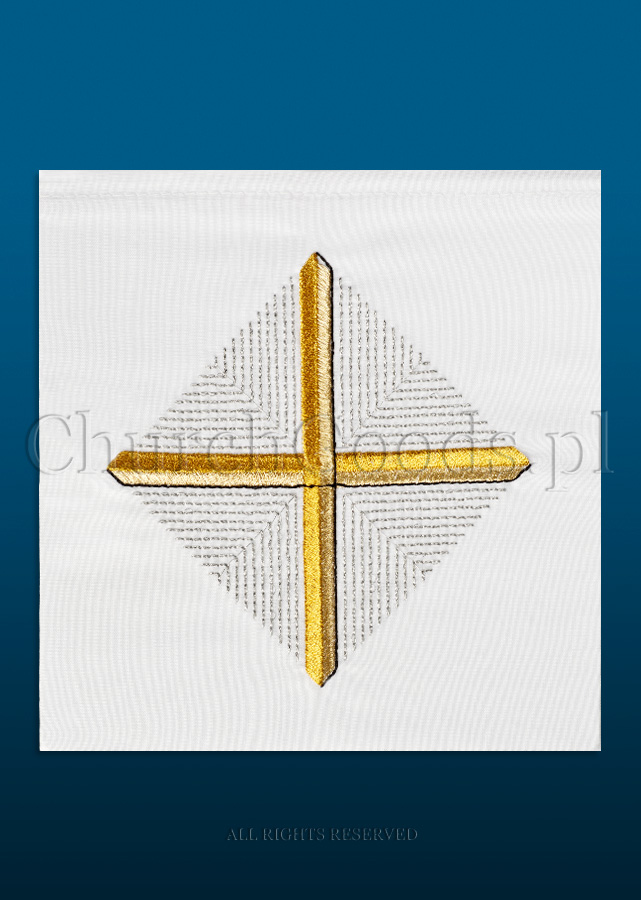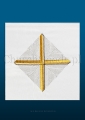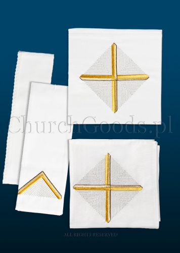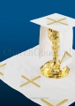 Machine embroidered chalice linen set. Set is composed of a corporal, purificator, pall with a movable plastic insert and a non-embroidered lavabo towel.