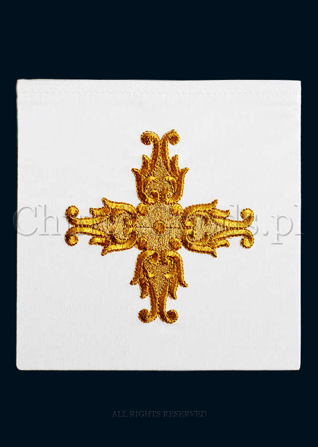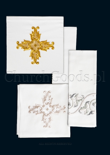 Machine embroidered chalice linen set. Set is composed of a corporal, purificator, pall with a movable plastic insert and a non-embroidered lavabo towel.
