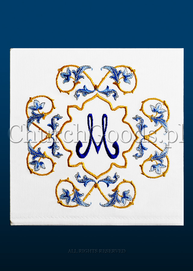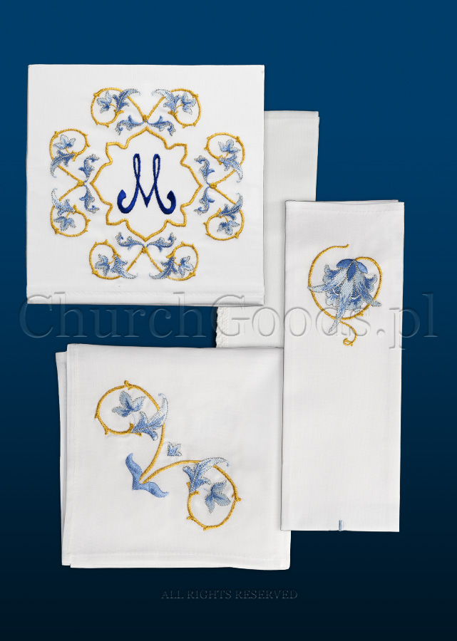 Machine embroidered chalice linen set. Set is composed of a corporal, purificator, pall with a movable plastic insert and a non-embroidered lavabo towel.