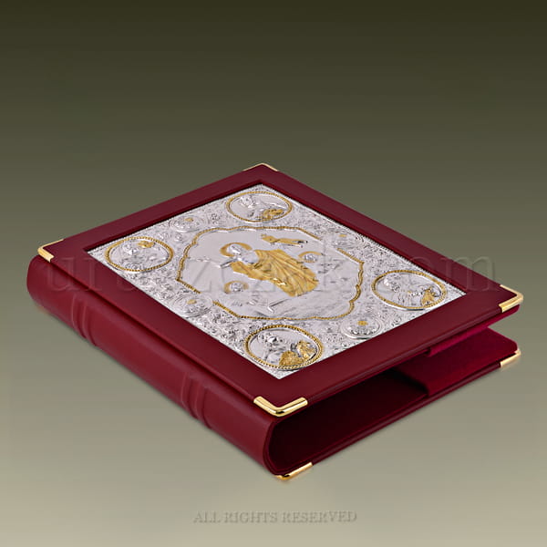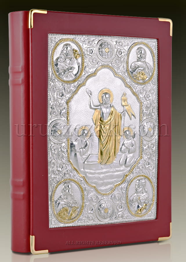 The cover for book of the Gospel for solemn celebrations. Decorated with silver and gold plated icons of the Resurrection of Christ on the front and an embroidered Jerusalem Cross on the back. Protected with end caps on all corners.