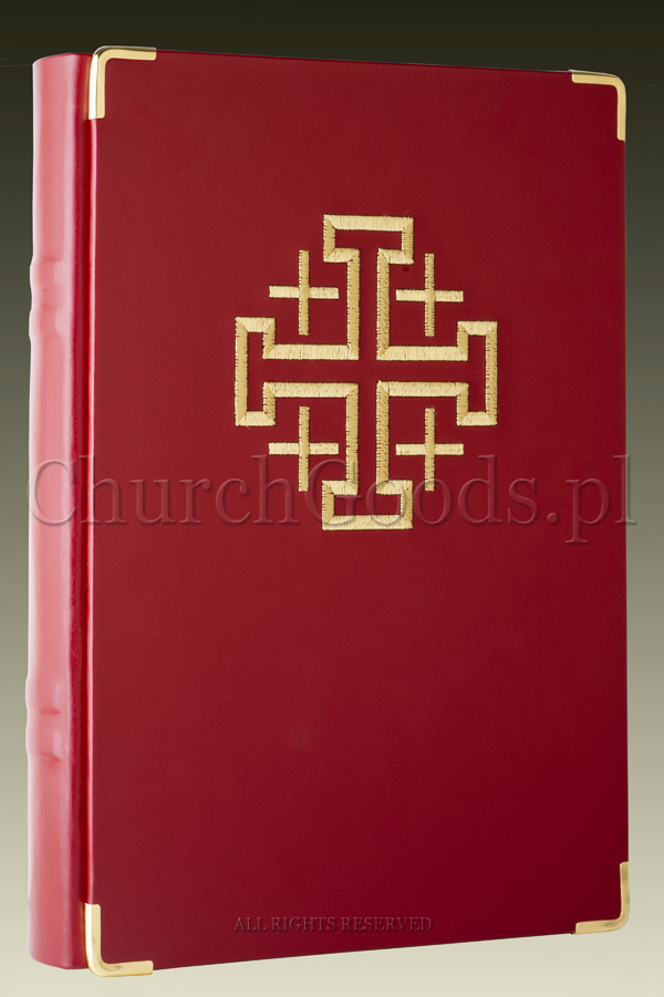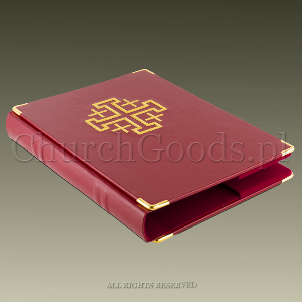 The cover for book of the Gospel for solemn celebrations. Decorated with embroidered Jerusalem Cross on the front and back. Protected with end caps on all corners. Fits Pallottinum Gospels, case included.
