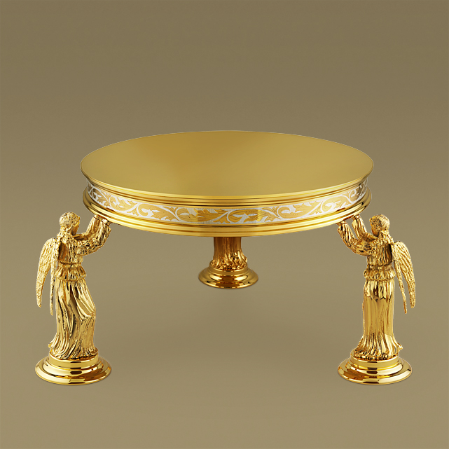 Thabor made of brass, gold-plated, with three figures of standing angels. The round plate is embellished with silver-plated floral patterns.