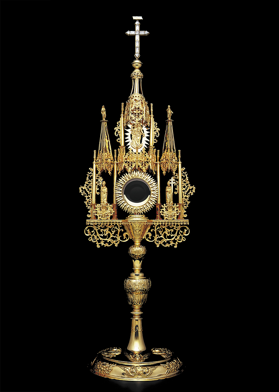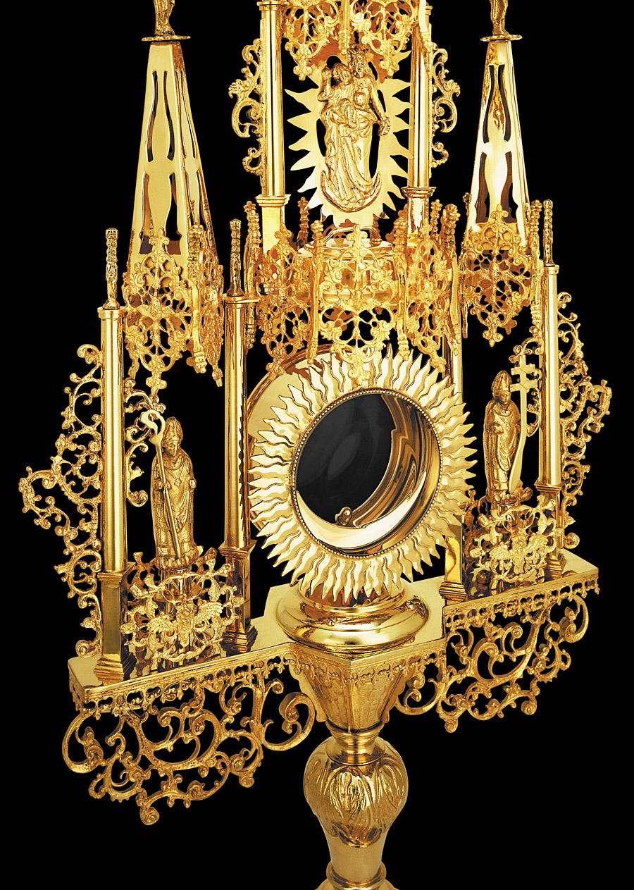 Gothic tower monstrance made of brass, entirely 24-karat gold plated. The upper part of the monstrance is adorned with architectonic elements in Gothic style such as pinnacles and fleurons. Pinnacles are topped with figures of Saint Anne and Saint Joaquin, while figures of Saint Adalbert and Saint Stanislaus stand on both sides of the luna case. The monstrance is topped with a spire which features a relief of the Blessed Mother sheltered by a canopy. The cross at the top is adorned with clear stones. The monstrance is highly decorated with floral filigree openwork. Carved floral motifs grace the base and the node. This monstrance is a replica of original models from the sixteenth century.
